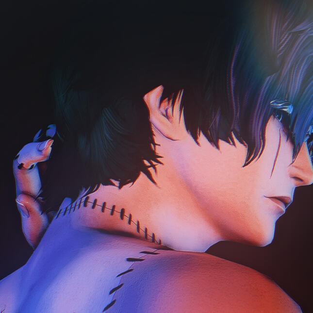 stitch and patchwork riddle his whole body beneath his conservative fashion sense. perhaps the most noticeable example is the encircling of stitches around his neck, typically hidden under high collars. keep your eyes to yourself, please.