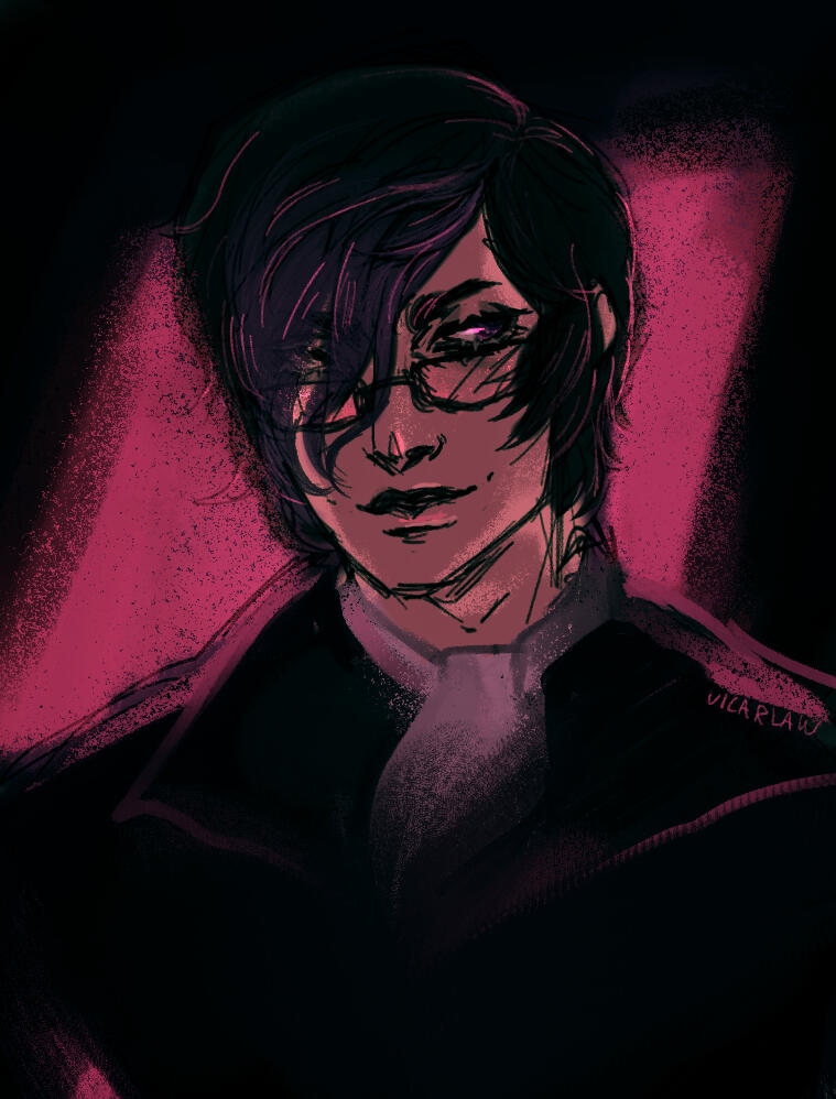 at times, it appears as if his left eye glows pink. hadrian is quick to deny such accusations even in the face of naked truth. though his expression is almost constantly in a crooked smile, the intensity of his emotions is betrayed by his eye's shine.